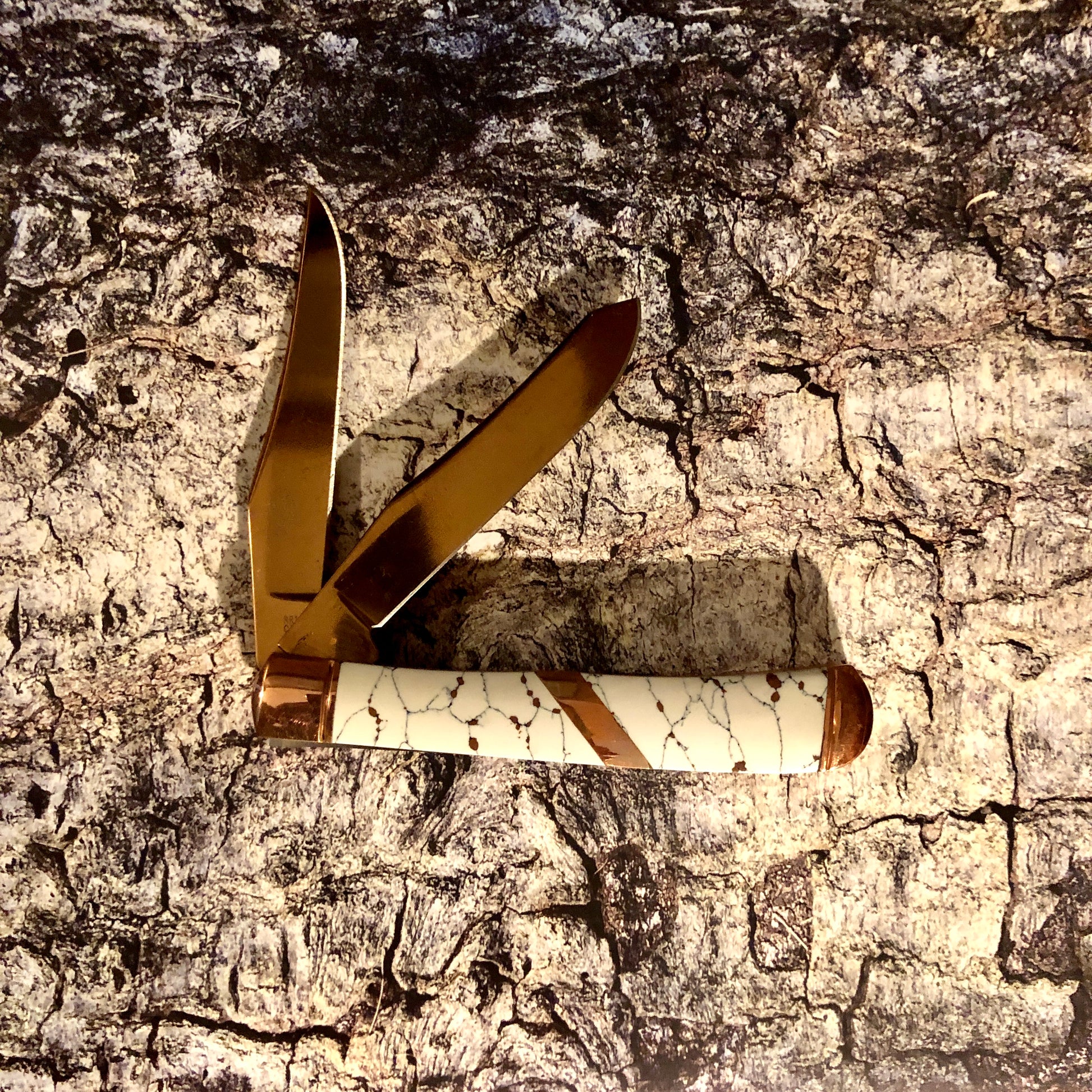 Blades: Dual-blade setup featuring a clip point and spey blade, both crafted from 440A stainless steel and coated in a stunning rose-tinted titanium finish.